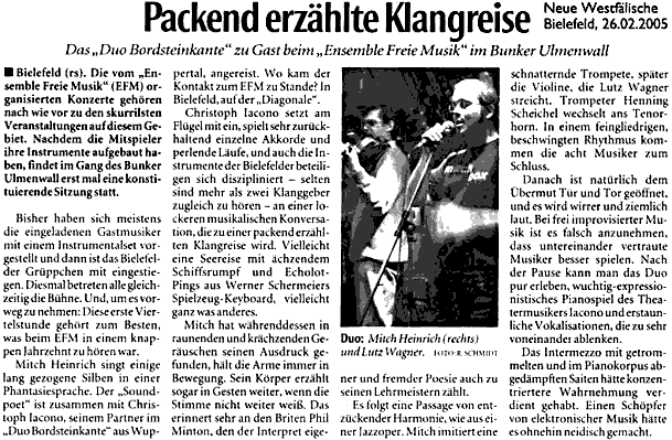 1950 geb. in vlotho/deutschland 1956 beginnend klavierunterricht/ nach intensiver ausbildung später ständige vervollkommnung im selbststudium ab 1971 studium der freien improvosation und minimal music 1972-74 studium gruppenimprovisation an der akademie remscheid 1972 mitglied der gruppe -klein phlotho- u.a. mit klaus olsen 1975 solo-programm taran - minimal music mit orgel, zeitverzögerungssystem und tonbändern 1979 auftritt beim musikfestival porta westfalica 1980 theatermusik zu der deutschen erstaufführung von dario fo´s erzengel flippern nicht in bochum 1988 mitwirkung bei der II. osnabrückermusik atem von willem schulz ab 1989 solo-programm moiré minimal music mit orgel und keyboards 1990 mitglied der -karman band- u.a. mit atzen wehmeyer 1991 mitglied bei -das blaue palais- improvisationen und auftragskompositionen 1992 duo olsen schermeier piano und schlagwerk 1994 duo olsen schermeier audio-cassette -atonality forever- zusammenarbeit mit peter brötzmann, john jasnoch, isabeella beumer u.a. 1998 cd windgrimassen solo-piano, live-mitschnitt von der nacht für improvisierte musik im bunker bielefeld ![]() performance des efm 1999 mitbegründer des efm ensemble freie musik / bielefeld http://www.freie-musik.online.de 1999 zusammenarbeit mit der malerin gisela schuto hör-bilder mit der performance -abgespult- dazu die CD E.M.S.II 1999 kunstlinie projekt mit dem bundesverband bildender künstlerinnen und künstler owl mit dem efm 2000 mehrere aktionen und musikperformances mit dem efm anlässlich verschiedener kunst und musikevents 2001 produktion einer cd mit improvisationen im duo mit lutz wagner piano und violine 2003 soloprogramm -pythia- im rahmen der -nachtansichten- im bbk-atelier bielefeld 2004 produktion der cd -spectaculum- mit dem ensemble e.r.o.s. electric, röhrig, olsen, schermeier wolfgang röhrig: e-gitarre klaus olsen: schlagwerk werner schermeier: synthesizer 2004 gemeinsam mit seinen freunden vom ensemble e.r.o.s. mehrere auftritte innerhalb der diagonale bielefeld 2. oktober 2004 lange nacht der neuen musik bielefeld / oetkerhalle